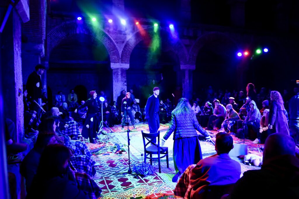 Kuzey Makedonya Türk Tiyatrosu, bir sahnesi bulunmadığı için The Blind’ı Kurşunlu Han adlı tarihi bir yapıda sergiliyor. Qëndrim Rijani’nin yönettiği ve Balkan milliyetçiliğinin körleştirici gücünü sorgulayan The Blind dört dilde —Türkçe, Arnavutça, Makedonca ve İngilizce— seyirci karşısına çıkıyor. Körlüğün sadece fiziksel değil, toplumsal olduğu vurgusunu yapan oyun, Maurice Maeterlinck’in The Blind (Kör) ve Amin Maalouf’un In the Name of Identity: Fatal Identities (Ölümcül Kimlikler) eserlerinden esinleniyor. Oyun metni tanıtımına göre Körler, Maeterlinck’in görünmezi sözcük ve imgeler aracılığıyla görünür kılma çabasıdır. Eserin temel temaları olan duyarlılık ve algı, düşmanca bir çevreyi ve bu çevreden kaynaklanan felaketi betimlemeye hizmet eder. İnsanın bilinmeyen bir kadere teslim oluşu ve körlerin iletişim kuramaması, Camus’nün “absürd” anlayışına ve Beckett ile Ionesco’nun tiyatrolarında karşımıza çıkan modern insanın durumuna bir ön gönderme niteliğindedir. On iki isimsiz karakter, geçmişlerinin labirentinde dolaşarak kişisel anılarını yeniden hatırlıyor ve varoluşsal ikilemlerle yüzleşiyor. İzlediğimiz oyun, engellere rağmen birleşen bir aşk hikâyesiyle umutla son buluyor. Rijani’nin sahnesi, post-Yugoslav, çok-etnili bir Balkan düşüne yazılmış bir aşk mektubu gibi. Oyuncuların çoşkusu ve hikâyelerin samimiyeti, soğuk havaya rağmen oyunun keyifle izlenmesini ve bol alkış almasını sağlıyor.