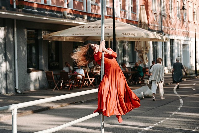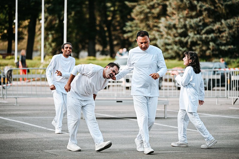 Festivale Türkiye’den katılan Gonca Gümüşayak yazar, koreograf ve performans sanatçısı olarak bir sokak gösterisinde ilgiyle izlendi. Oyunu Akışkan Politikalar’da sanatçı hayatımızı tanımlayan dijital kodların, sınırları ve sorumlulukları olmayan köpüklü ama yıkıcı etkilerinden söz ediyor. Yazar gerçeklik algısının sürekli baltalandığı, bir krizin ortasında bile bir şeylerin satılmaya çalışıldığı durumu bir kıyamet tasviri olarak görüyor. Uzun kuyrukların olduğu Rusya’ya geçilen sınır kapısının tam karşısında büyük bir meydanda kırmızılar içinde özgürce sergilenen performans her türlü sınıra meydan okur gibiydi.